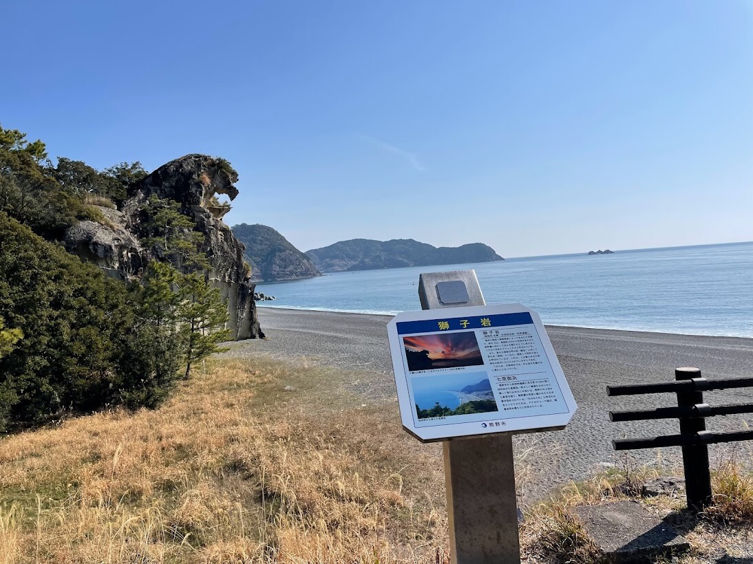 2日目からは国道42号線に戻り、ほぼずっと海沿いを走ります。この辺は熊野灘に沿って約20キロに及ぶ七里御浜と呼ばれる砂浜があり、国道はそれに沿っています。道中の獅子岩は、たいていこういうのはこじつけ感がある中でかなり本物のように見えました。また巨岩信仰で知られるの花の窟も参拝しました。