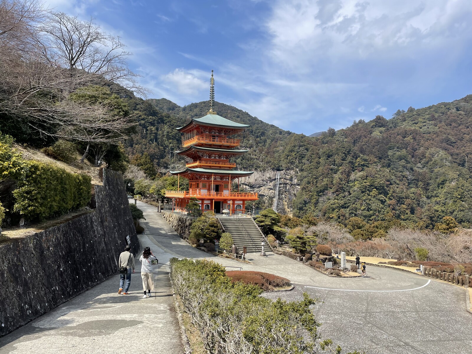 昼過ぎには着いてしまったので、足を延ばして隣町の熊野那智大社まで向かいました。坂を上った先にある熊野那智大社は有名な那智の滝がある神社で、熊野三山の一つを構成しています。落差の大きい滝は風が強いこともありほぼ見えず、自然の雄大さを感じました。