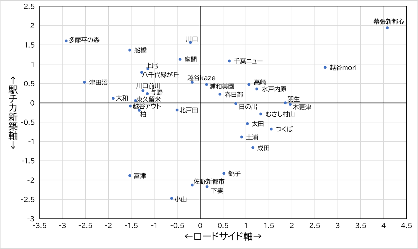 いままで5つの種類のデータ(5次元データ)だったのを2つの種類のデータ(2次元データ)で説明できるようになっています.1つめの軸は「ロードサイド軸」です.総賃貸面積が広く,駐車場台数が多く,周辺人口が少ないイオンモールは高い得点(つまり右側にプロットされている)を得ています.対して逆の傾向を持つイオンモールは低い得点(つまり左側にプロットされている)を得ています.2つめの軸は駅チカ新築軸です.駅からの距離が近く,開業からの年数が浅い傾向にあるイオンモールは高い得点を得ています.(つまり上側にプロットされている.)対して逆の傾向を持つイオンモールは低い得点を得ています.(つまり下側にプロットされている.)
