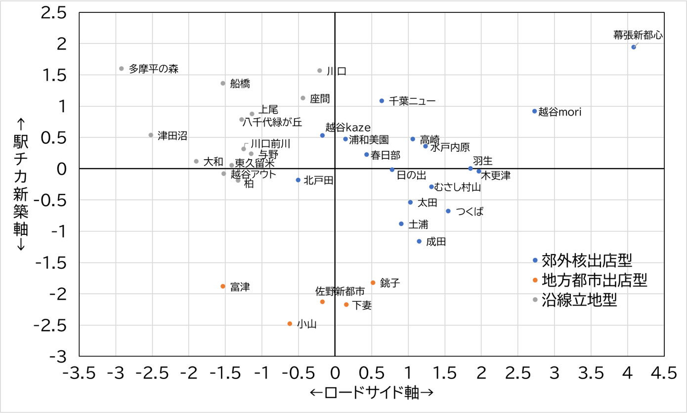 - 郊外核出店型の場合,ロードサイド得点と駅チカ新築得点の双方が高いです.郊外核出店では鉄道へのアクセスも考慮した立地を取るが,同様に鉄道からのアクセスを考慮している沿線立地型とは,店舗の規模が大きく周辺人口が少ない点で異なることがわかります.本分析のみで結論づけることは困難ですが,都市密度と地価の関係,再開発余地のある大規模用地の有無などが影響を及ぼしている可能性があります.