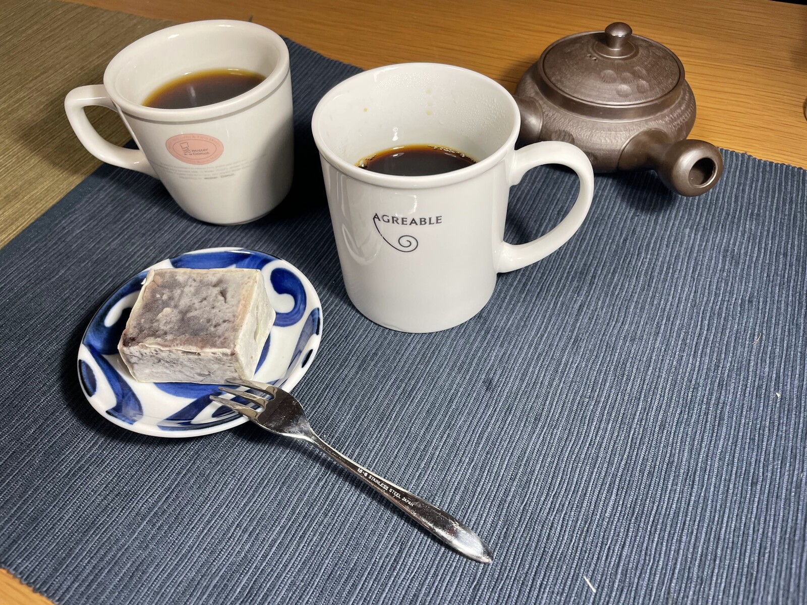 ホットのタンポポコーヒーのお供は、前日に筆者宅を電撃的に訪ねてきた父上から賜った、新潟は岩室の老舗、角屋悦堂の金鍔である。