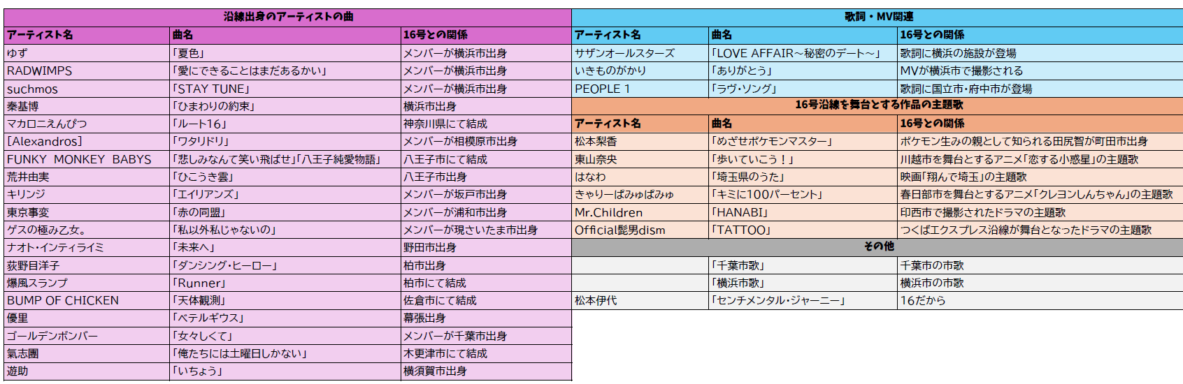こちらがそのときに作ったプレイリストです。国道16号沿線出身のアーティスト、沿線を舞台とするアニメの主題歌、MVが沿線で撮られた曲…など、「国道16号にまつわる曲」を32曲厳選しました。バランスをできるだけ心掛け、様々な年代、さまざまなタイプの曲を集めました。(曲数を16の倍数にしたのも地味にこだわりポイントです。)