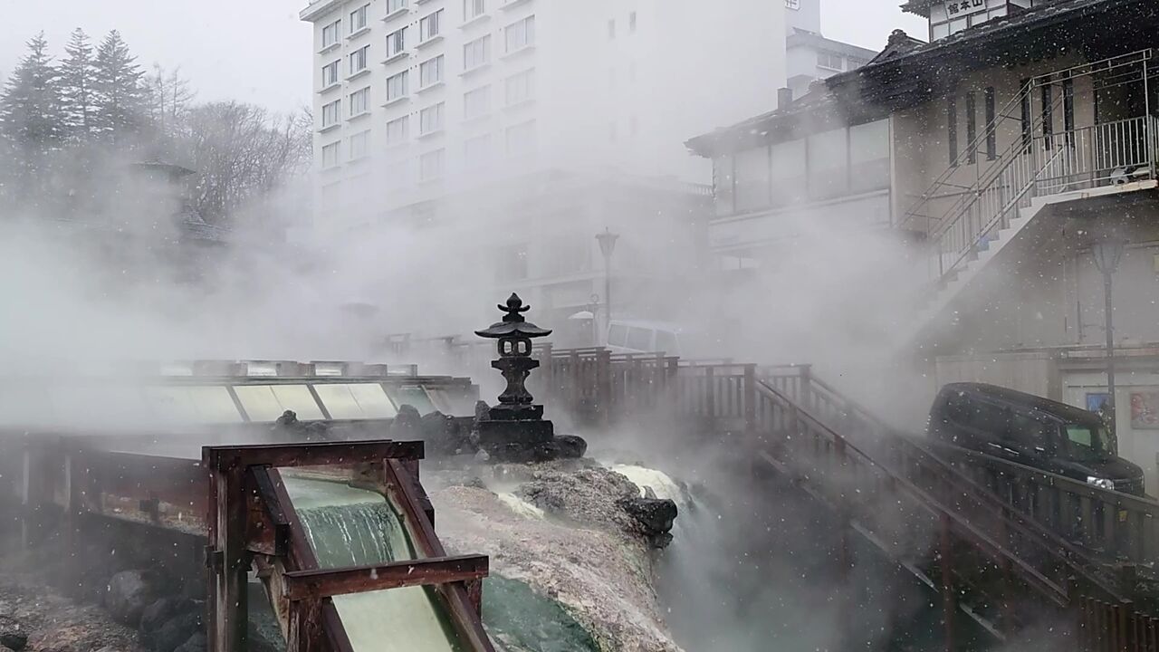写真だと非常に伝わりづらいが、雪が大量に舞っている。温泉の湯気と相まって少し幻想的である。来てよかった。