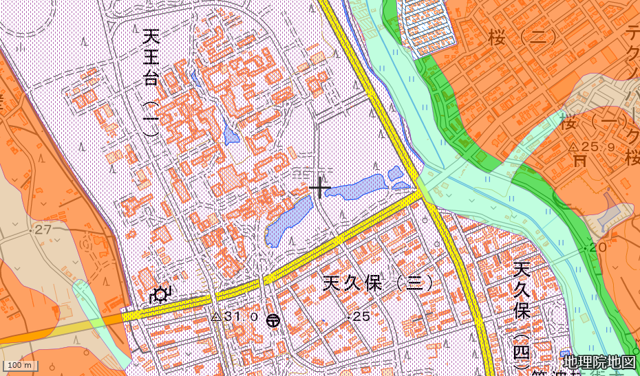 ・・・大学一帯に広がる点の模様。これは「改変工事中の区域」を示すものです。実は、この付近の調査が行われたのは1975年。筑波学園都市の建設真っただ中です。そのため、北は筑波大学の先にある花畑から南は国道354号 (つくば駅のはるか南) までに及ぶ広い範囲が改変工事中として指定されています。これではよくわかりませんね。