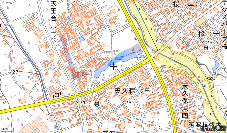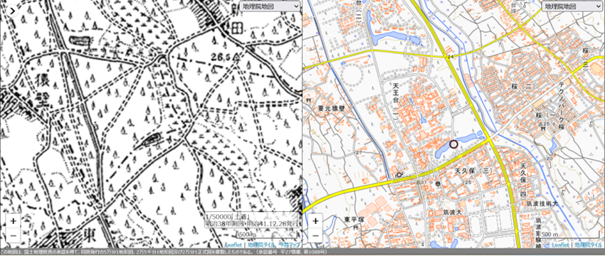 この図で非常に興味深いのが、筑波大学開学前は道の通り方が今と大きく異なっていたことです。学園都市と呼ばれる一帯全域に当てはまる傾向ですので、昔の地形図と見比べながら学園都市建設を振り返ってみると楽しいかもしれません。