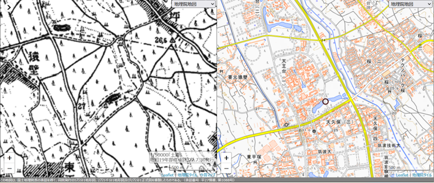 では、昔の地形図では現在の松美池はどのようになっているのでしょうか。こうした際に役立つのが、埼玉大学におられた故・谷謙二先生が提供されているサービス「今昔マップ on the web」です。
